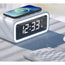 Digital alarm clock with integrated Qi wireless charging pad. Combines a bright LED time display and a charging dock in one compact, bedside-ready design.